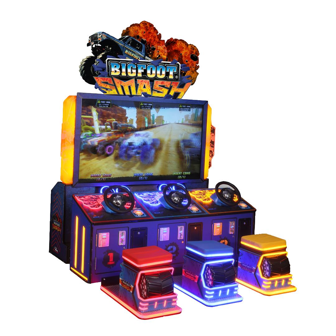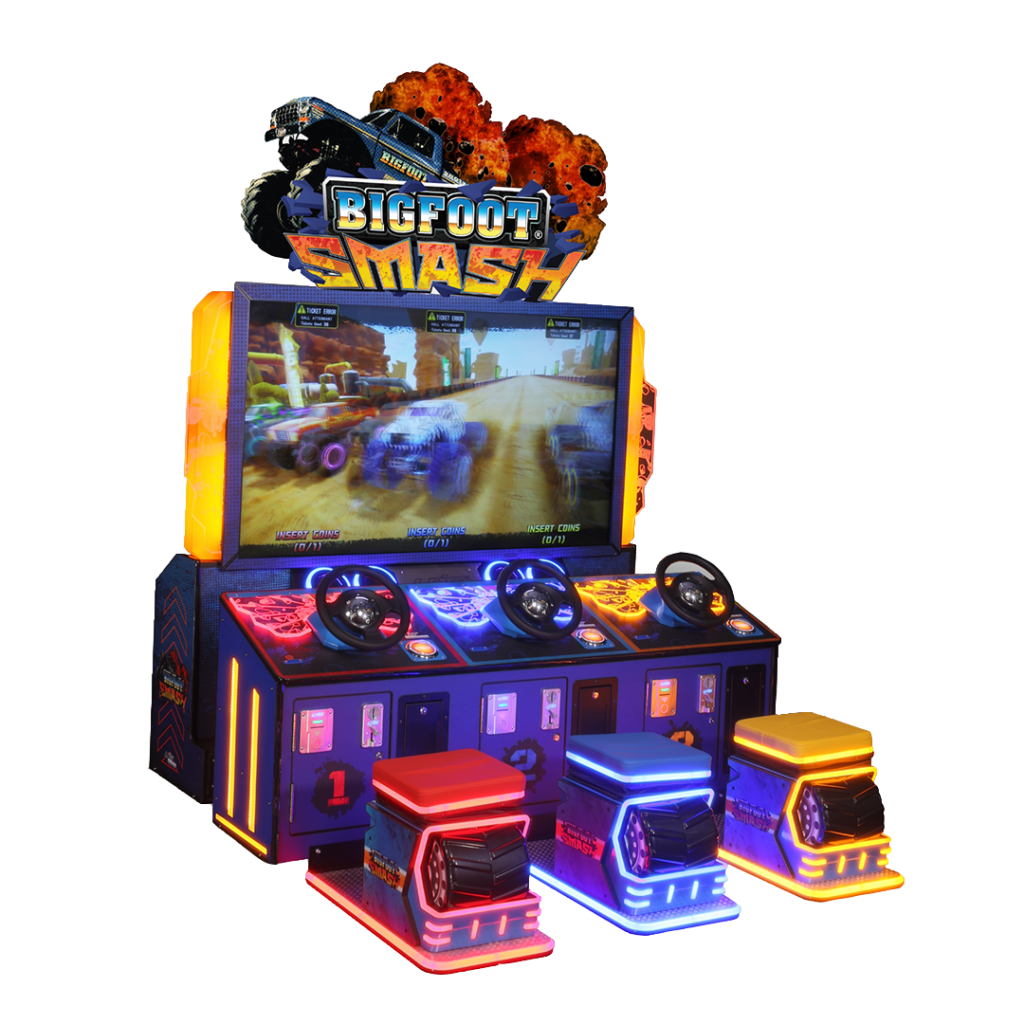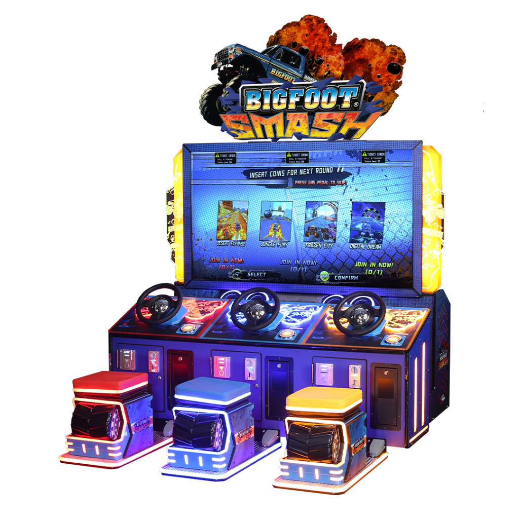 Après Big Foot Crush, la célèbre licence de course BIGFOOT® revient dans une nouvelle borne d’arcade : Big Foot Smash. Dans ce jeu de course à 3 joueurs, les utilisateurs sont invités à piloter des monster trucks grâce à un volant et des pédales physiques.