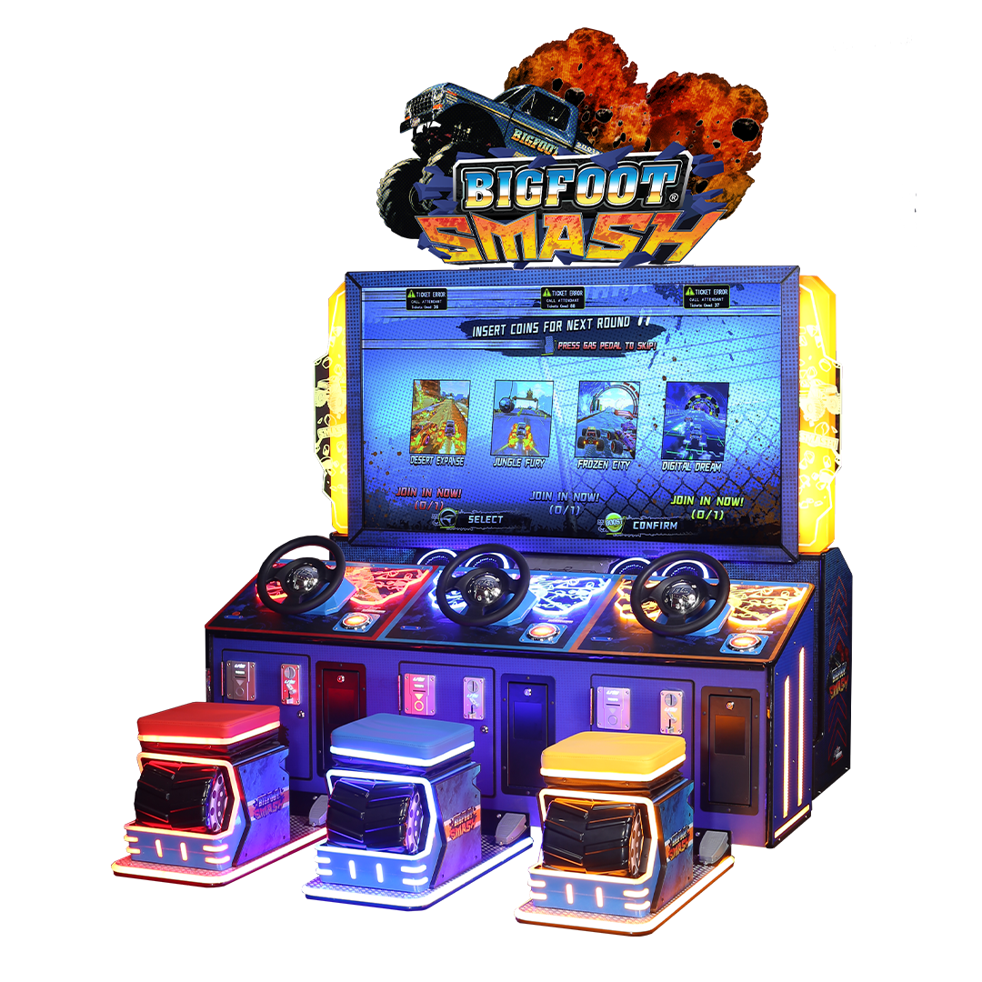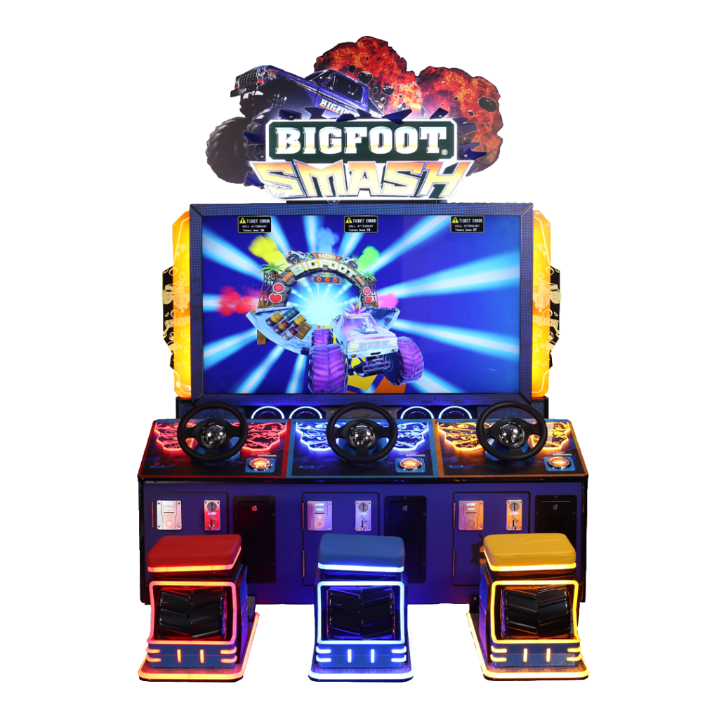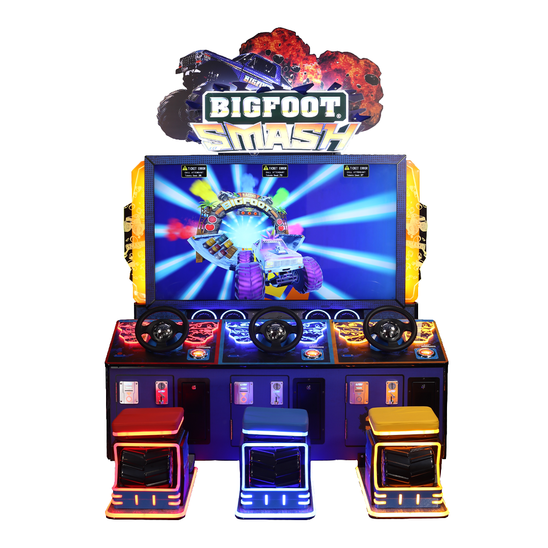 Après Big Foot Crush, la célèbre licence de course BIGFOOT® revient dans une nouvelle borne d’arcade : Big Foot Smash. Dans ce jeu de course à 3 joueurs, les utilisateurs sont invités à piloter des monster trucks grâce à un volant et des pédales physiques.