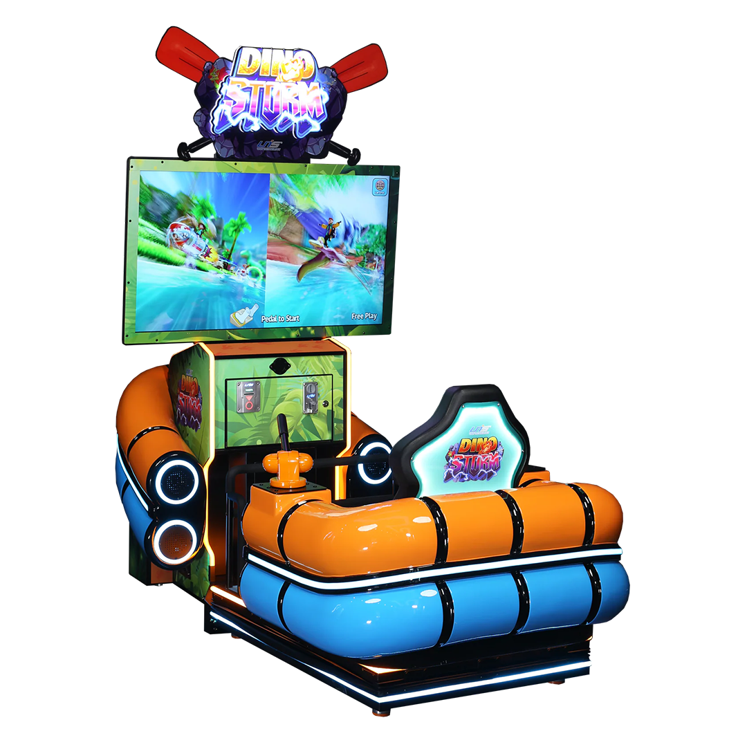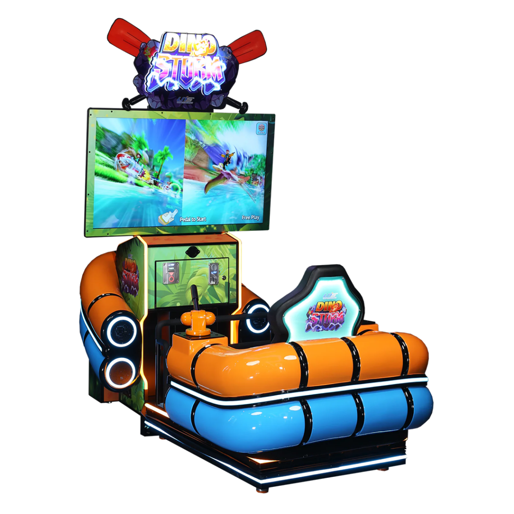 Dino Storm est un jeu d’arcade de rafting immersif qui plonge les joueurs au cœur d’un univers préhistorique. À bord d’un radeau dynamique, ils naviguent sur des eaux déchainées tout en combattant de féroces dinosaures.