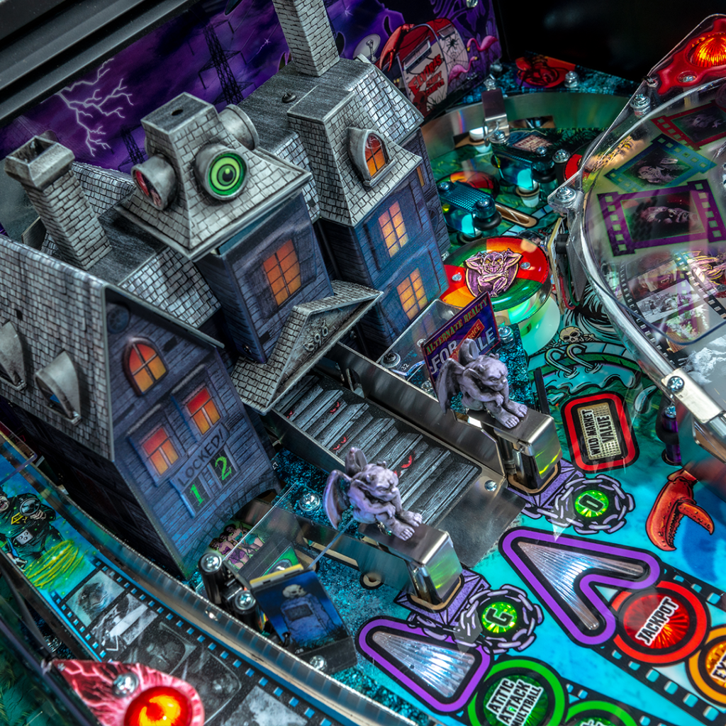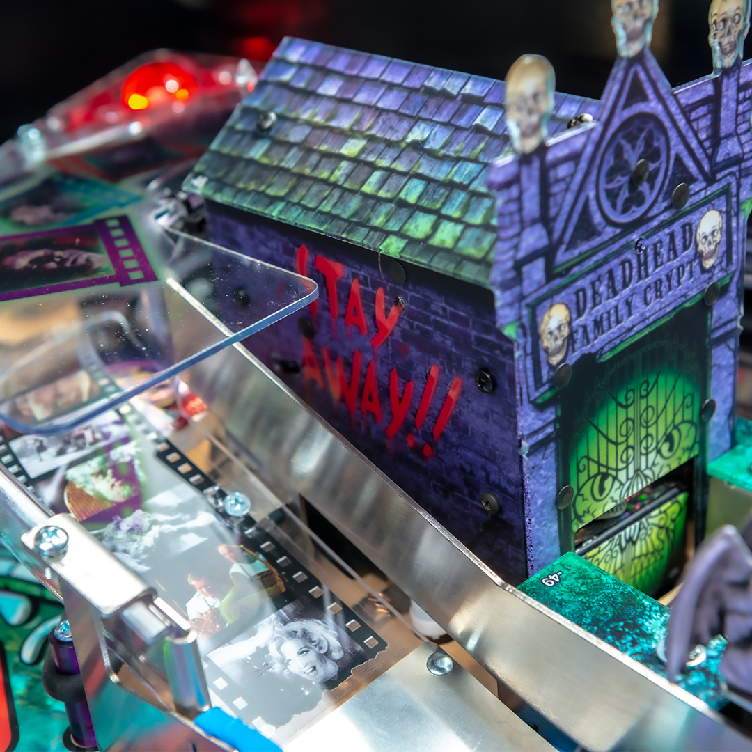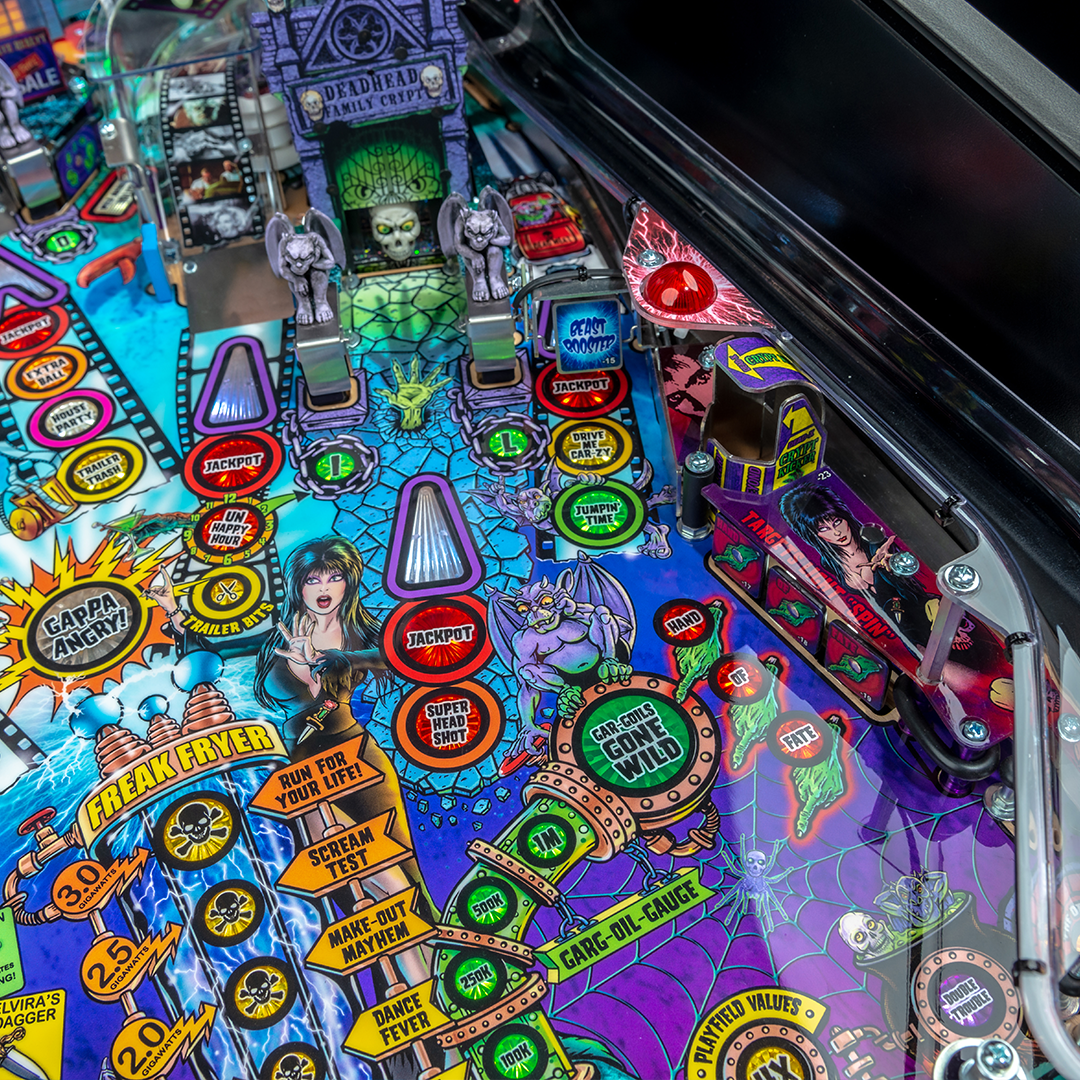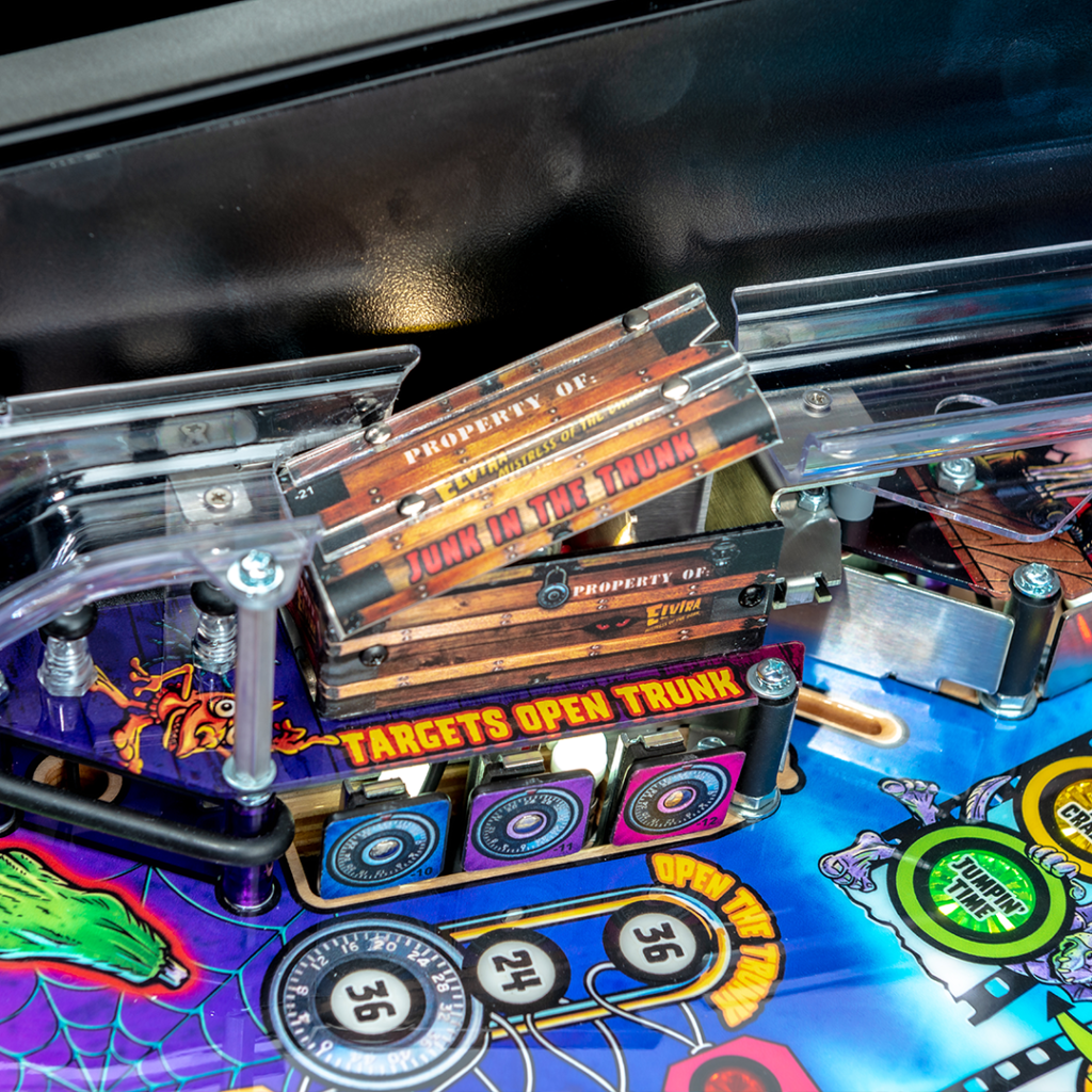 Les modèles Premium, Édition Limitée et Signature Edition mettent en scène la terrifiante House of Horrors, un manoir victorien interactif accessible par la porte d’entrée, la cave ou le garage, protégé par des cibles tombantes. Des éclairages RGB synchronisés, des fenêtres lumineuses et une tourelle de grenier rotative suivent la progression du joueur au fil des hantises. L’expérience est enrichie par la Deadhead Family Crypt, un mausolée interactif servant de bash toy, ainsi que par Elvira’s “Junk in the Trunk”, permettant de verrouiller les billes pour déclencher un multibilles frénétique.
