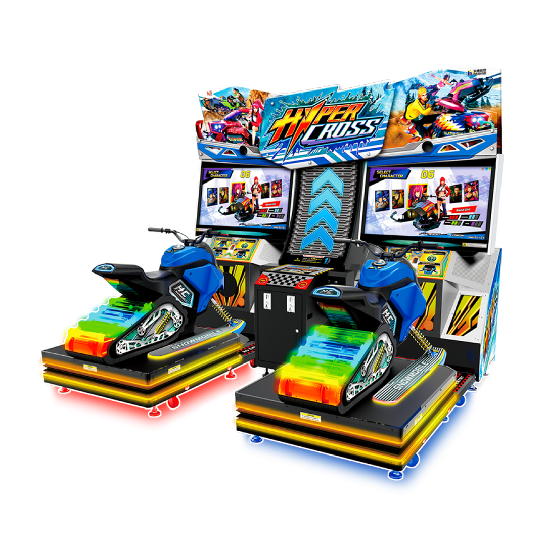 Hyper Cross révolutionne la course en motoneige grâce à sa plateforme de détection de mouvement à 3 degrés de liberté, offrant une immersion totale. Cette borne d’arcade équipée de deux motoneiges grandeur nature séduit grâce à son grand panneau d’affichage et son éclairage dynamique, parfait pour attirer les joueurs dans les salles d’arcade et centres de loisirs.